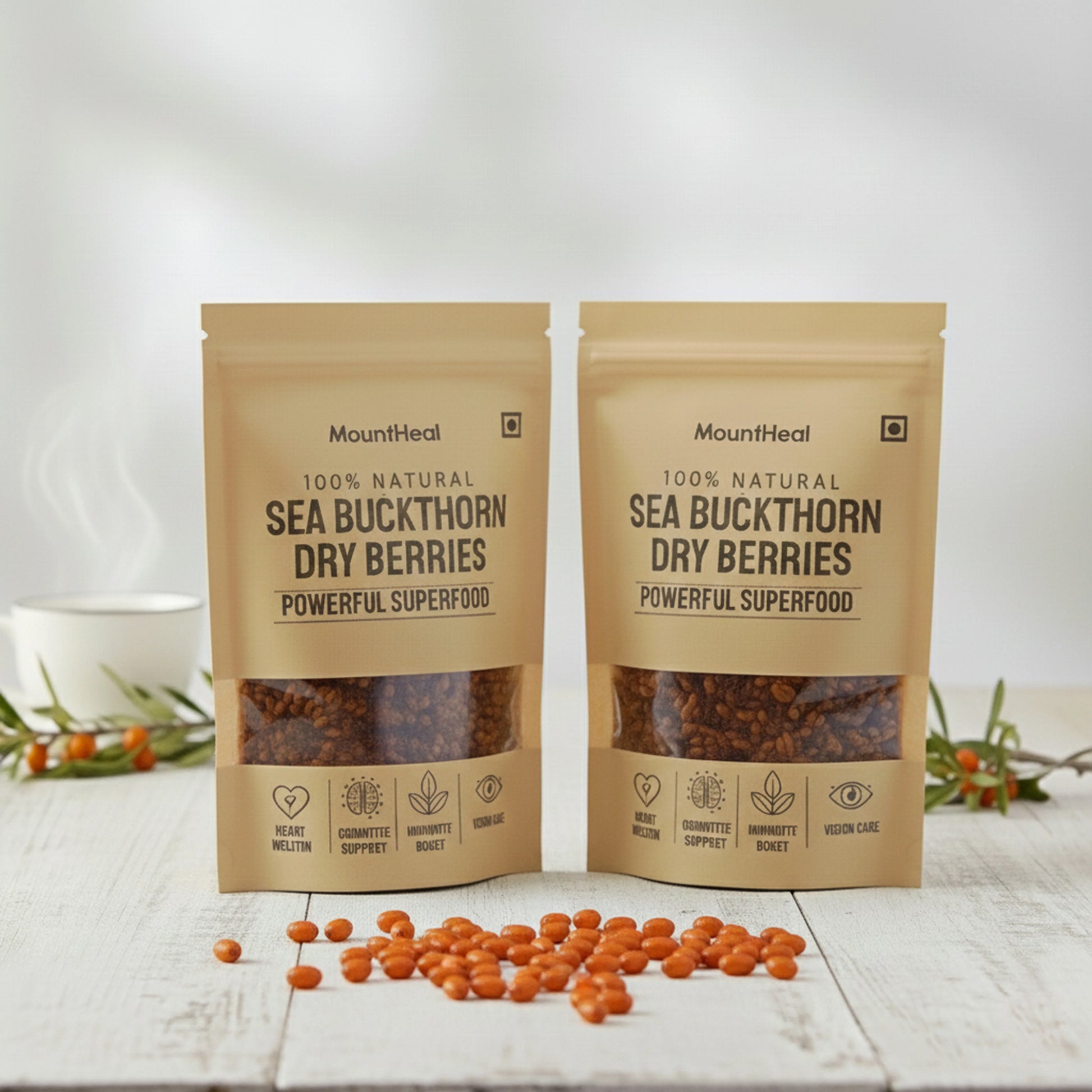 MountHeal Sea Buckthorn Dry Berries are handpicked from high-altitude Himalayan valleys and gently sun-dried to preserve their natural goodness. Each berry is packed with Vitamin C, Vitamin E, Antioxidants, Flavonoids, and Healthy Fatty Acids, giving you the complete benefits of the whole fruit.
